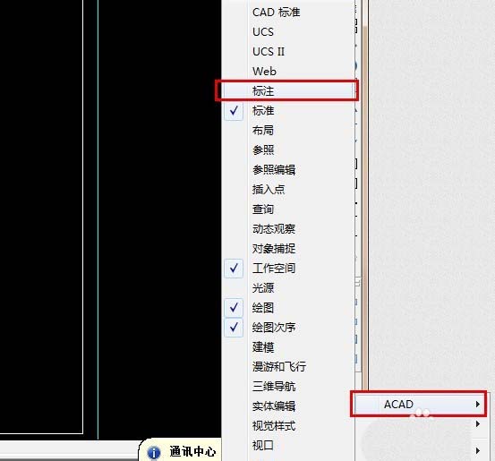 8、所有都画好之后就要把尺寸标注上,标注尺寸是在右侧工具栏,如果没有就在右侧工具栏空白处“右键”——鼠标移动到“ACAD”——就会出现工具栏选项了点击“标注”就会出现标注工具栏了,标注怎么设置这里就不在说了,以后会写一篇单独介绍标注设置的,请关注。