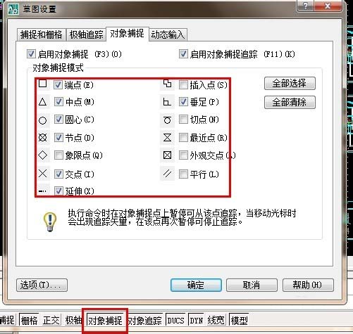 9、标注尺寸的时候需要用到“对象捕捉”,我们要对“对象捕捉”进行一下设置,在“对象捕捉”上右键就会出现设置,一般要把“垂足、断点、终点、圆心、节点、交叉点”都勾选上,选好了点击确认就可以了。