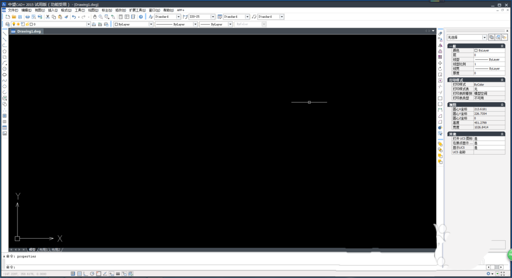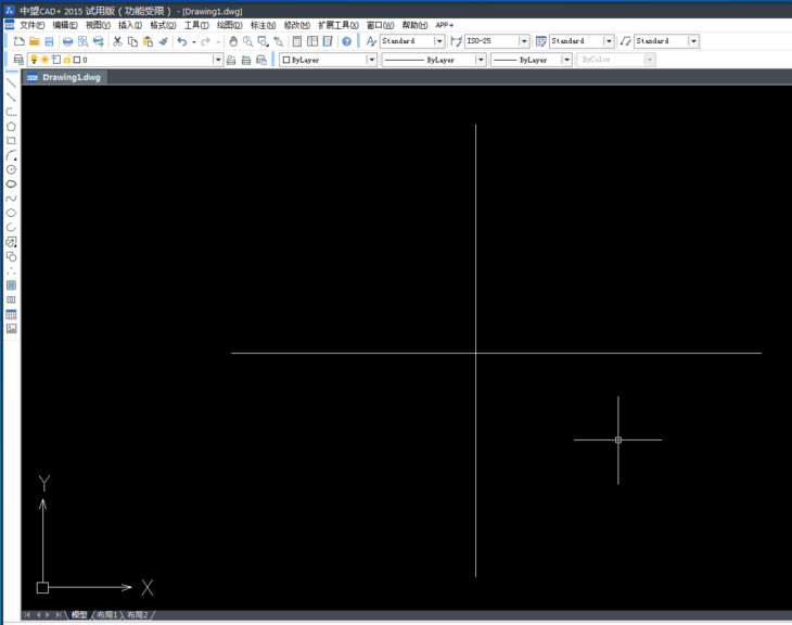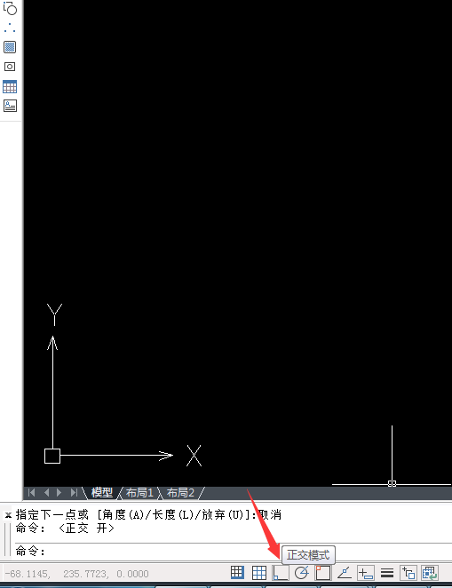 2、选择好直线工具之后,在下面的工具栏里选择正交打开,然后在画布上绘制两条垂直相交的直线,用作画图的中心线使用,然后选择圆工具,也可以直接按下C进行绘制,以交点为圆心画圆,点击圆心之后在命令栏里输入要绘制的圆的半径值,这里我是以平焊10kg法兰DN200的为例画的