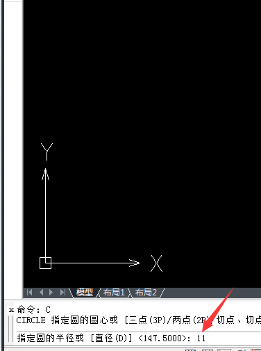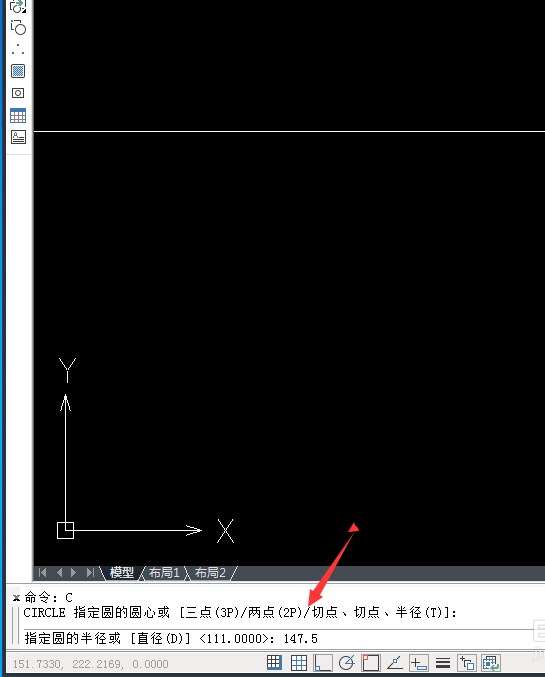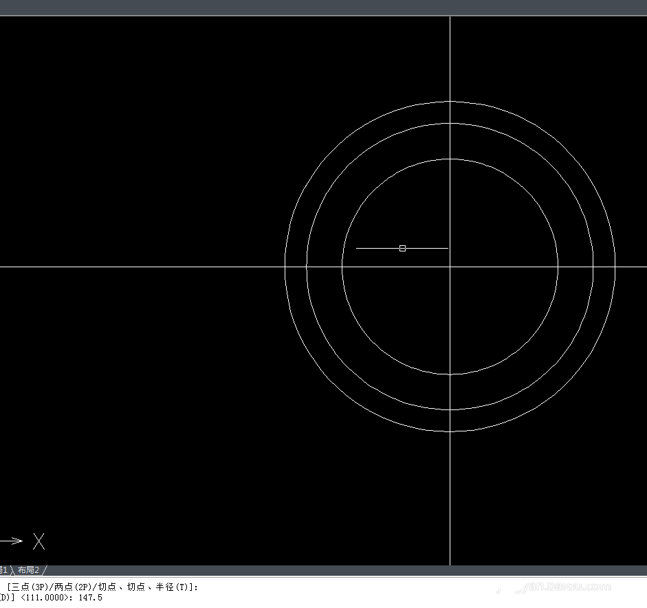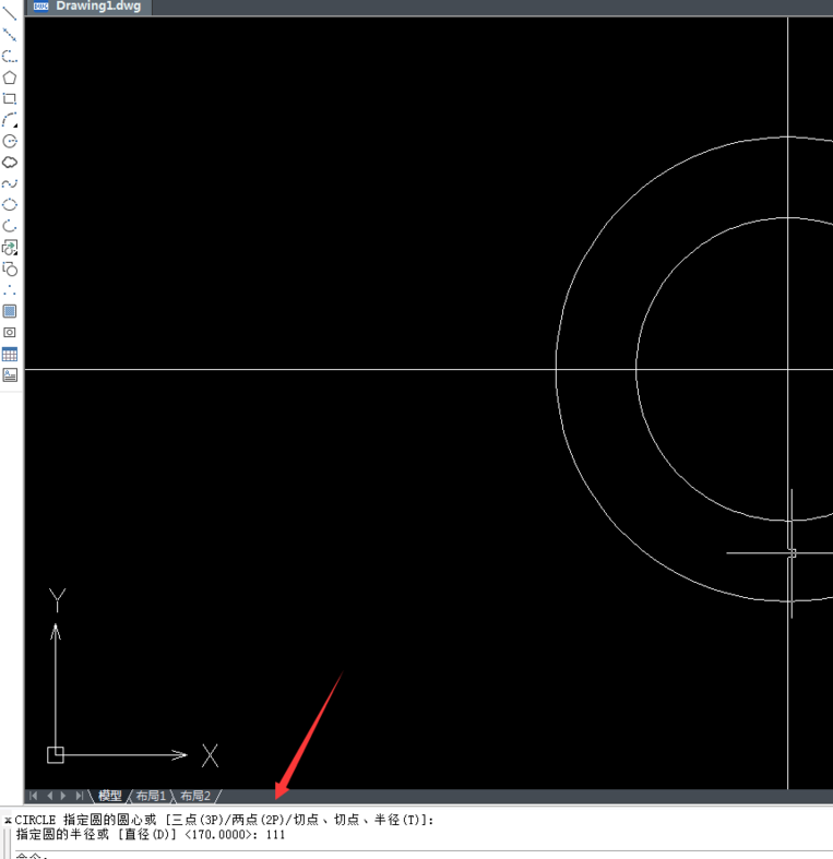 3、我们先绘制的是法兰的外径值,然后再重复画圆的步骤,画法兰的内径值,也是输入半径值,DN200法兰的内径是222 我们就输入111是法兰的内径值,以外径圆圆心为圆心画圆,
