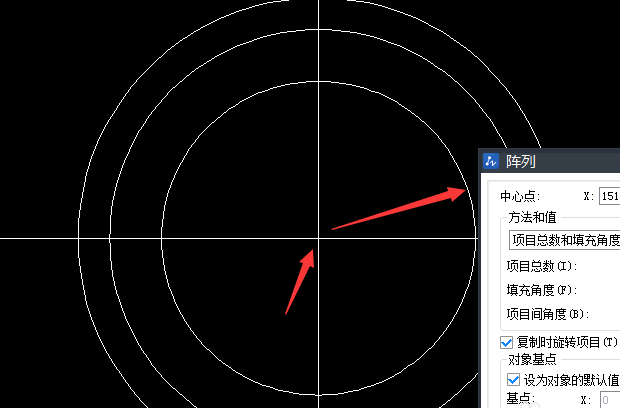 6、然后选择中心点,它会返回到画布上,在这里我们选择圆心就可以了,然后我们再输入我们要阵列出来的数量 就是说我们一共要画几个圆,包括这个初始圆在内,就是法兰一共几个螺栓孔,就输入几就可以,