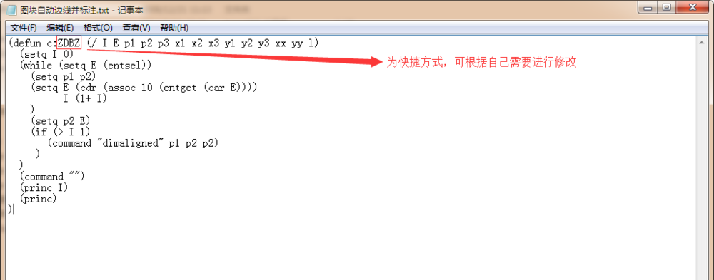 2、打开,将以下代码复制进去(其中第一句代码(defun c:ZDBZ (/ I E p1 p2 p3 x1 x2 x3 y1 y2 y3 xx yy l)里的ZDBZ为快捷方式,可根据需要自己修改)