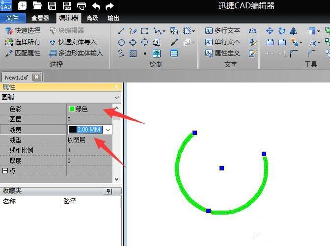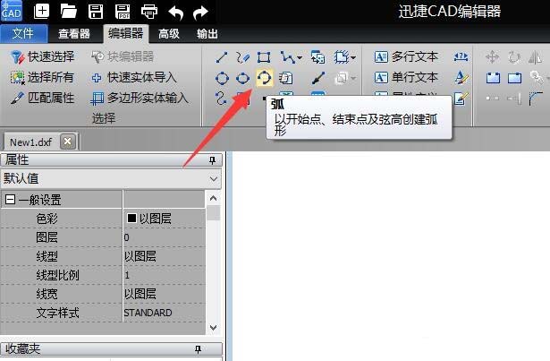2、首先我们任意选择一款CAD编辑器,如图所示,点击“新建”按钮即可创建一个新的DXF文档。如图所示,切换到“编辑器”选项卡,点击“工具”栏目中的“弧”工具。