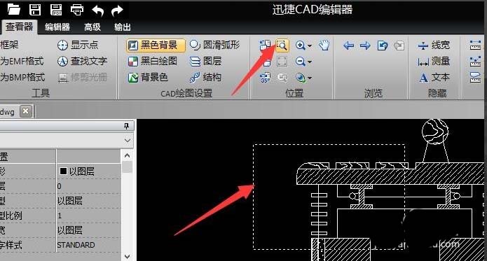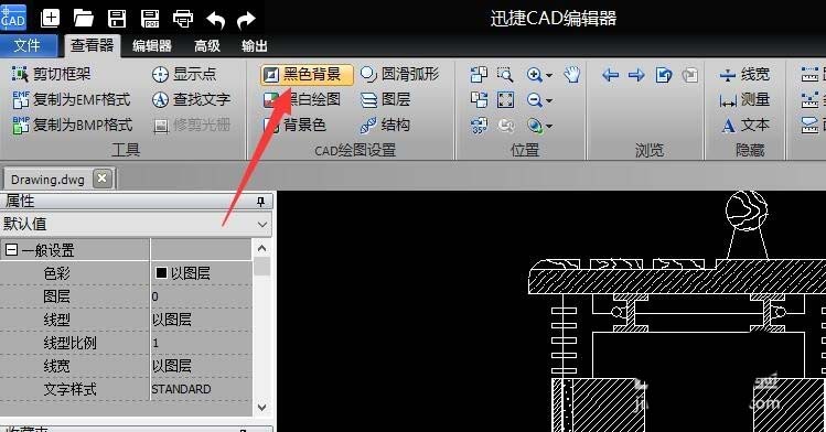 3、待打开DXF图纸文档后,我们可能更喜欢在黑色背景下进行编辑操作,对此切换到“查看器”选项卡,点击“黑色背景”按钮即可。