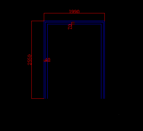 1、首先绘制门套,高为2250,宽度为1900。调用偏移命令,将线段依次向内偏移40,70.