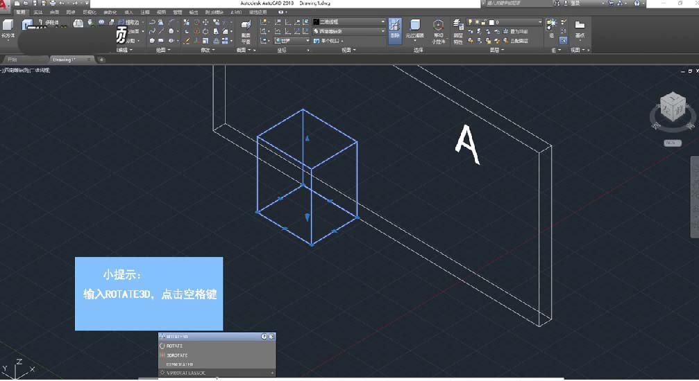 2、选中该立方体,在命令行中输入ROTATE3D,点击空格键确定。