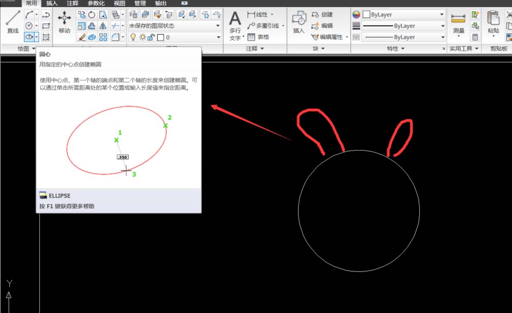 2、用【椭圆:EL / ELLIPSE】命令,画兔子的两个长耳朵,如图