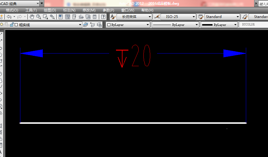 2、如下图所示,画一条长20的线段,并标注一个尺寸,作为演示所用。