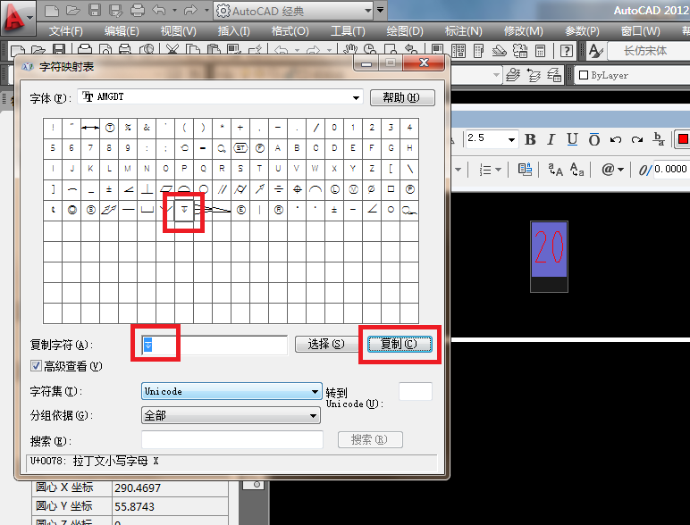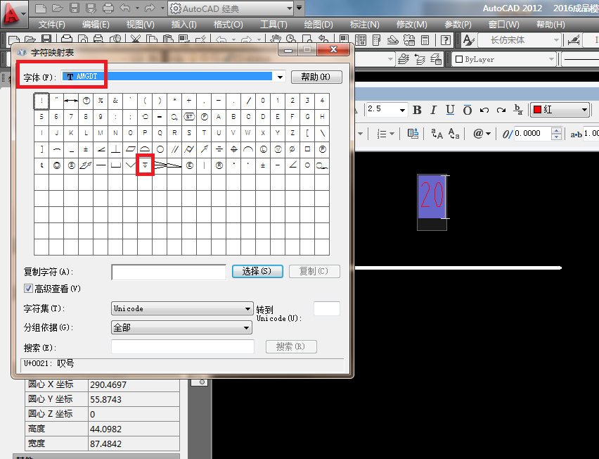 5、如下图所示,弹出了“字符映射表”,先选择字体“AMGDT”,在出现的字符中找到深度符号。说明一下,这个字体也是一个一个的找的,看那个字体中有深度符号,就选择哪个字体。