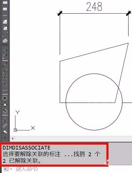 6、会看到CAD执行了一个“DIMDISASSOCIATE”的命令,已经解除了刚才选择的标注的关联。