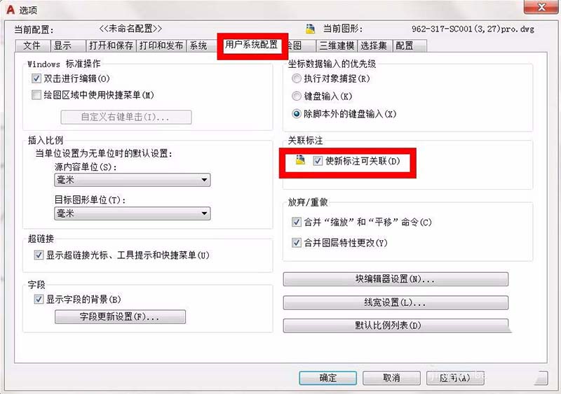 9、选择页面卡“用户系统配置”,将“使新标注可关联”前面的勾取消。确认后生效。以后所有的新标注,均默认不关联。在需要标注关联的时候,可以再将关联打开,方法同上。
