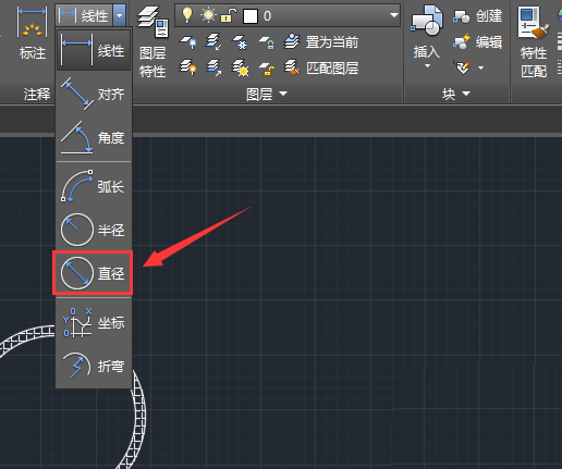 7、点击线性标注在其下拉列表里找到直径选项,如图所示: