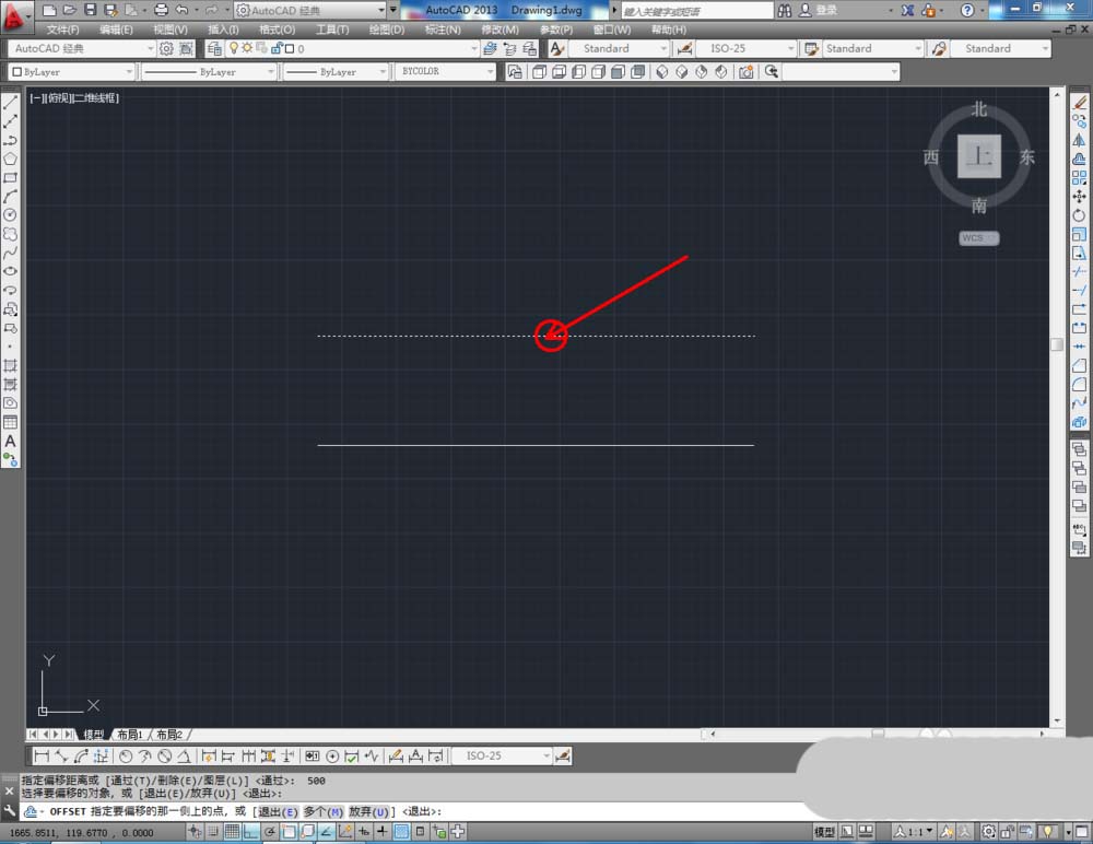 2、点击右边工作栏中的【偏移】,设置偏移数量:500mm后,鼠标点击选中线段并移动向想要偏移的方向,按下空格键(如图所示);