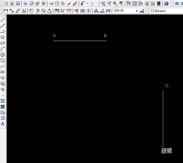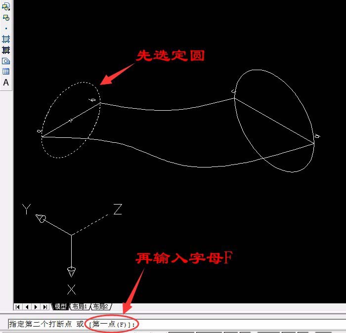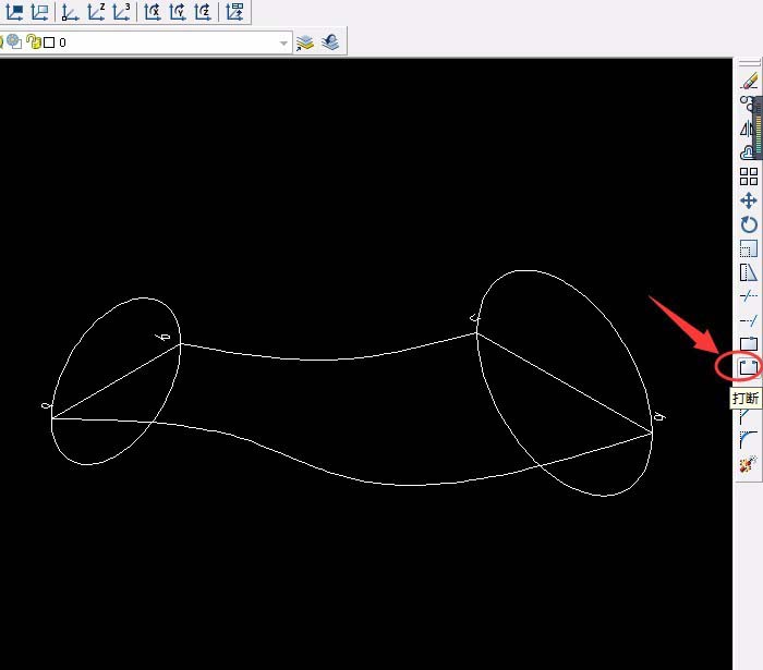 4、单击“圆工具”以cd线中心为圆心,端点为半径画出圆,因为直线和圆在不同的面,所以不能用修剪工具,单击“打断工具”选圆,输入字母F(第一点)选a端点,再选b端点,用同样的方法打断另一个圆(一定要选到端点,四条线是组合成闭合的面)。再选定直线ab线cd线删除。