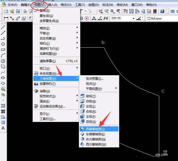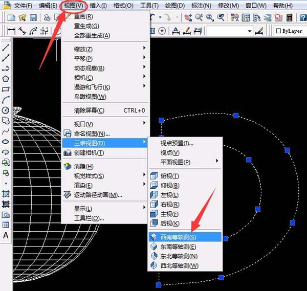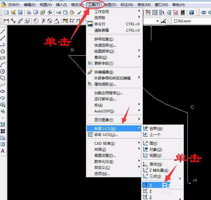 2、单击“视图”菜单中“三维视图”中“西南等轴测”,单击“工具”菜单中“新建UCS”中单击X轴,已默认X轴方向旋转90°按空格键确定。