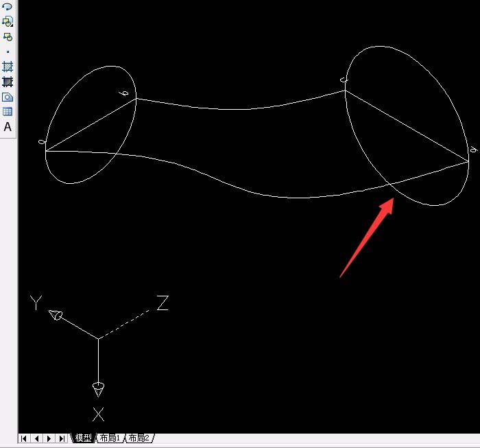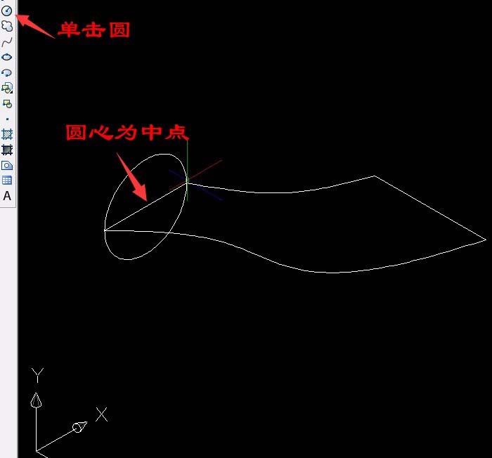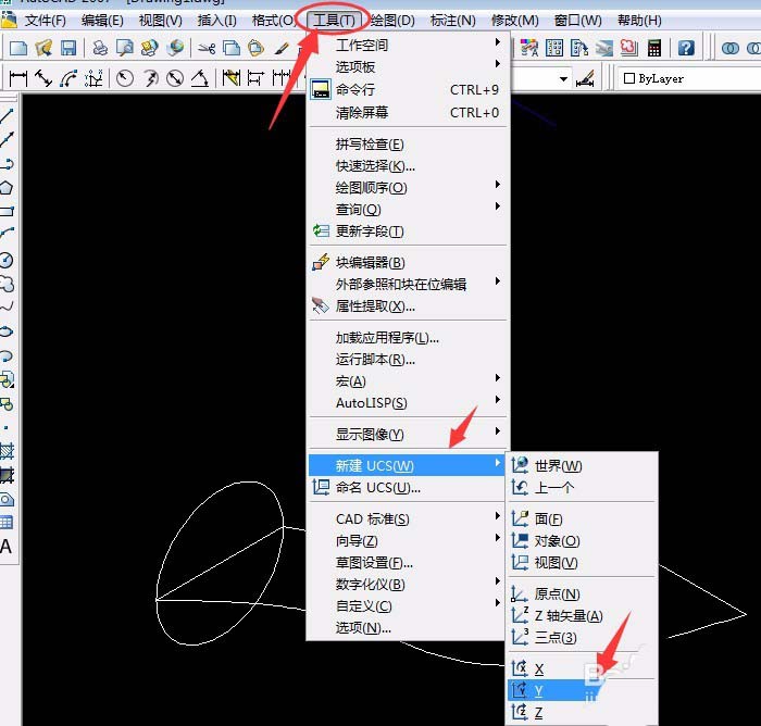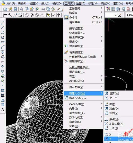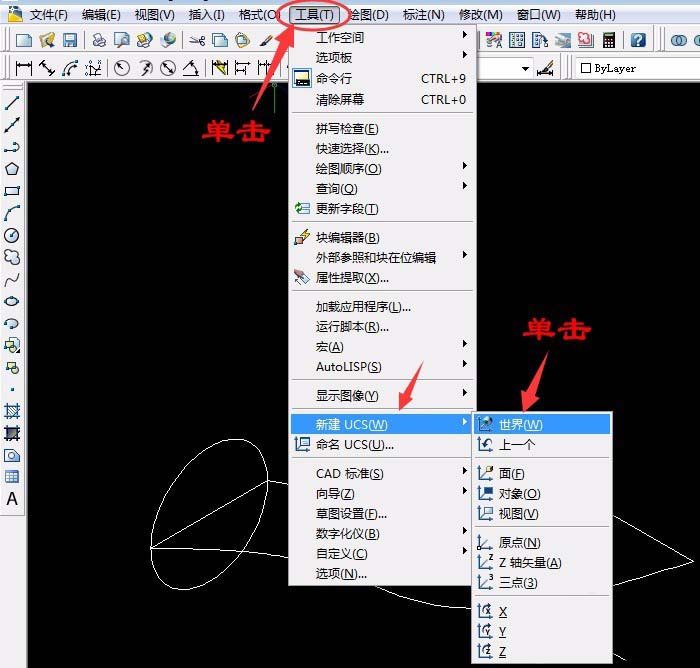 3、单击“圆工具”以ab线中心为圆心,端点为半径画出圆,单击“工具”菜单中“新建UCS”中单击“世界”,再单击“工具”菜单中“新建UCS”中单击Y轴,已默认Y轴方向旋转90°按空格键确定。