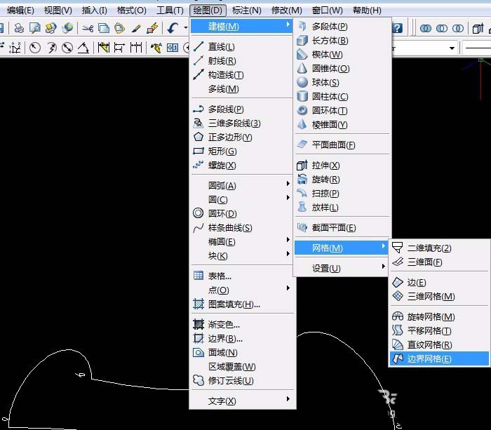 6、单击“绘图”菜单→建模→网格→边界网格,依次选定4条边界曲线,如果如图: