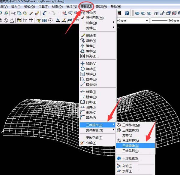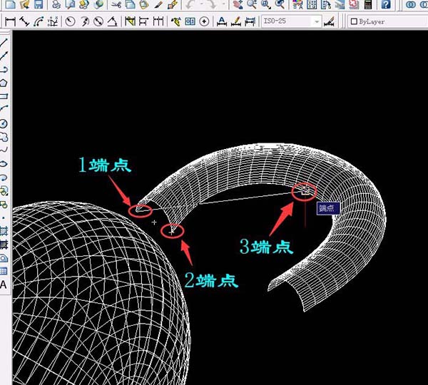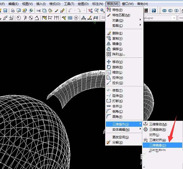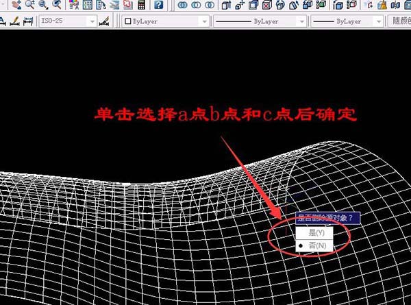 7、单击“修改”菜单→三维操作→三维镜像,单击选择曲线,再单击选择a点b点和c点后按空格键确定。
