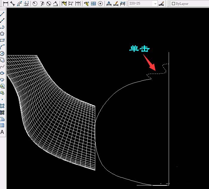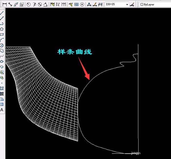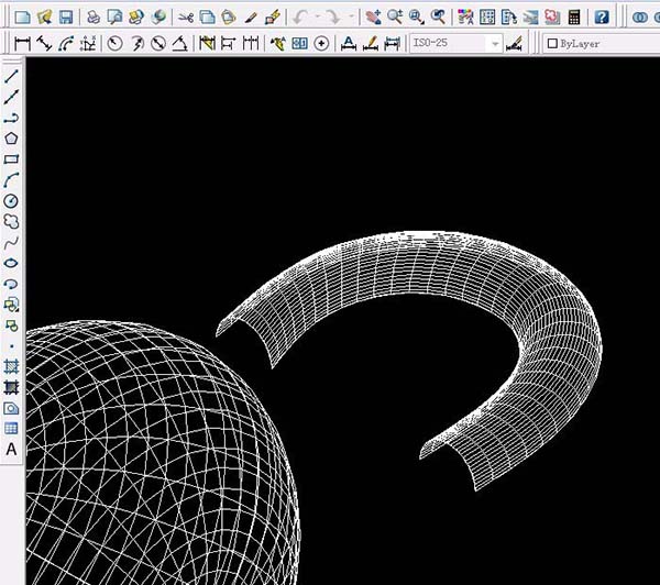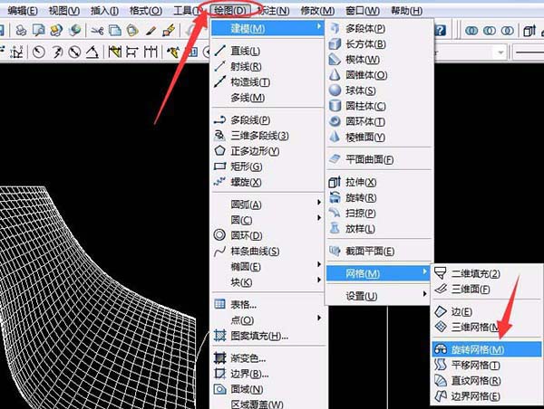 9、单击“绘图”菜单→建模→网格→旋转网格,选第一条样条曲线再选直线,确定两次(按两次空格键),用同样的方法旋转另一条样条曲线。