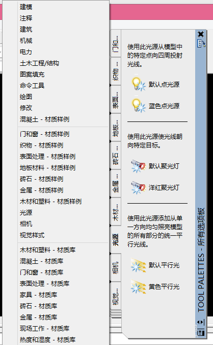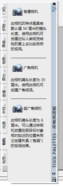 4、在工具选项板窗口左侧我们可以看到很多主选项,从这些主选项中的最下面选择更多以后我们就可以看到相机选项,如图