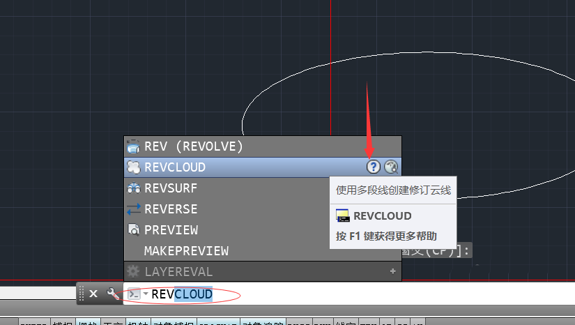 3、然后在命令栏中输入revcloud命令,该命令即为修订云图命令,这里你可以点击命令栏中的问号,然后查看软件的命令详情。