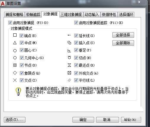 4、设置捕捉模式如图打开,然后设置你需要的捕捉如图:
