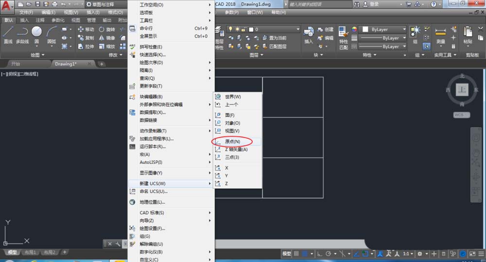 8、接下来在工具栏下,新建ucs找到原点,并移动原点 如图: