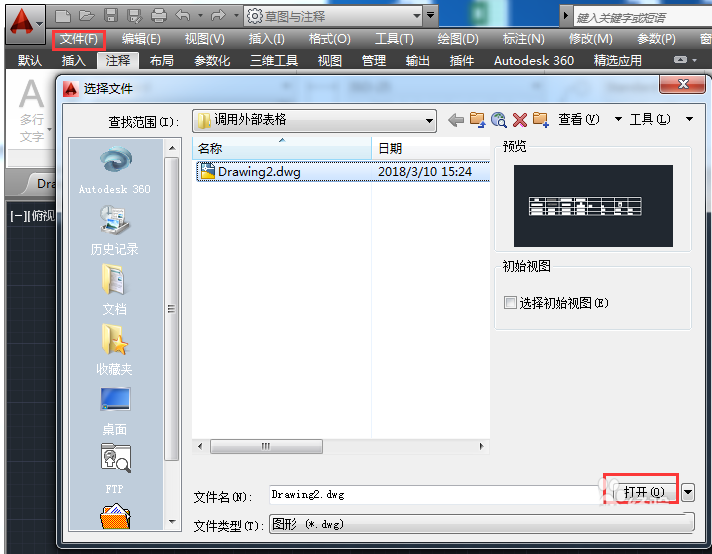 2、通过菜单栏的【文件】》【打开】方式,载入有数据表格的cad文件。