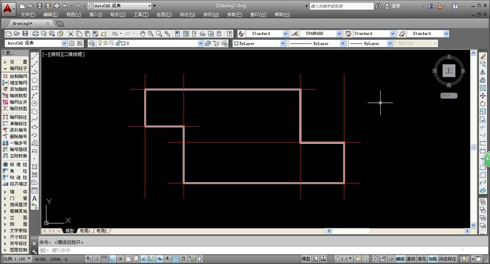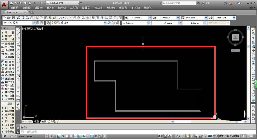 6、建筑图纸中的基础墙体,尤其是外墙,首先绘制成封闭墙体,确定建筑物的基本轮廓,之后可以用门窗等命令来修改墙体;完成墙体绘制后,我们即可进行墙体轴线的插入。