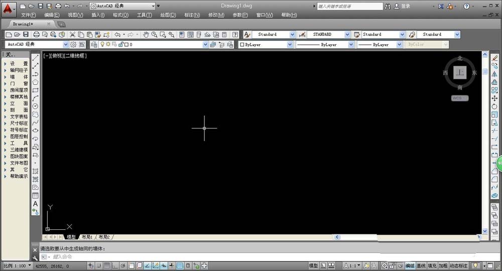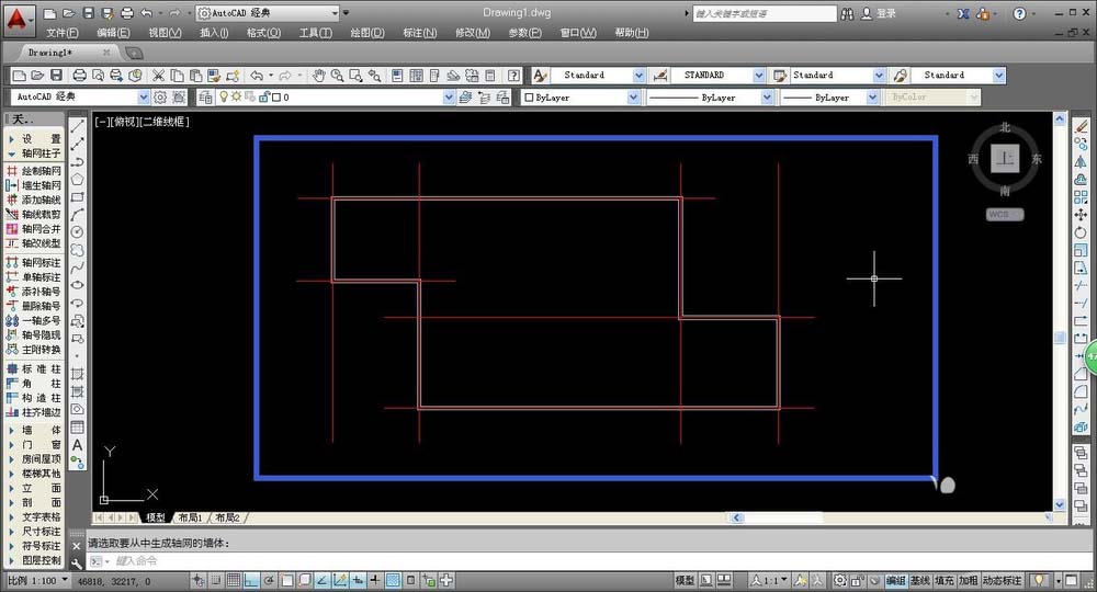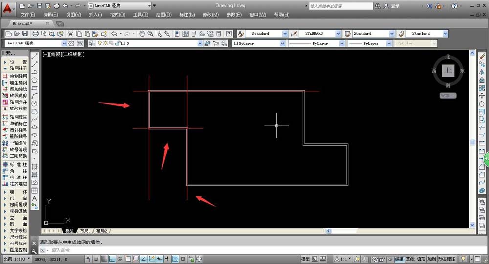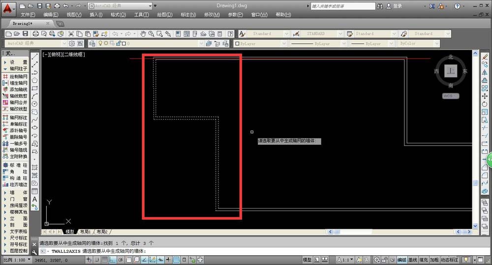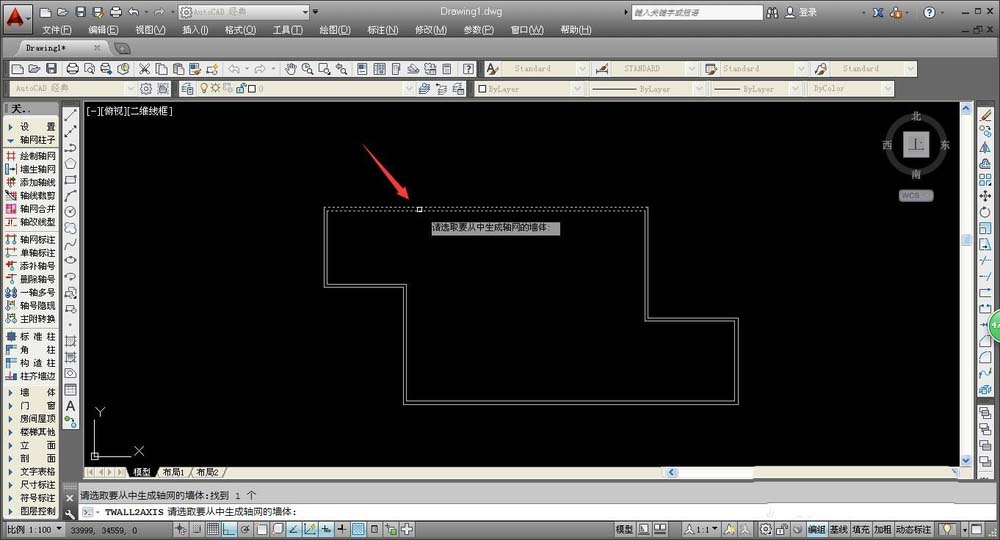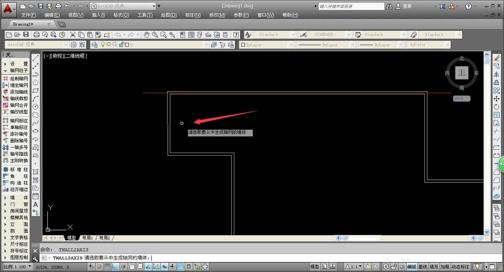 1、在墙体中添加轴线,我们先选择合适的操作命令,在AUTOCAD左侧工具栏中,选择“轴网柱子——墙生轴网”,确定命令后,将鼠标移动到绘图处,即可看到系统提示。