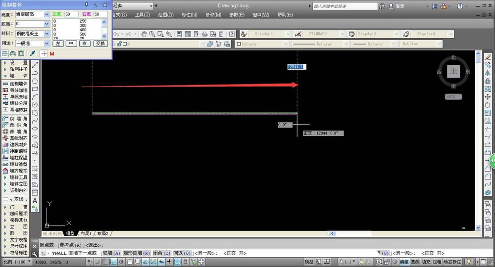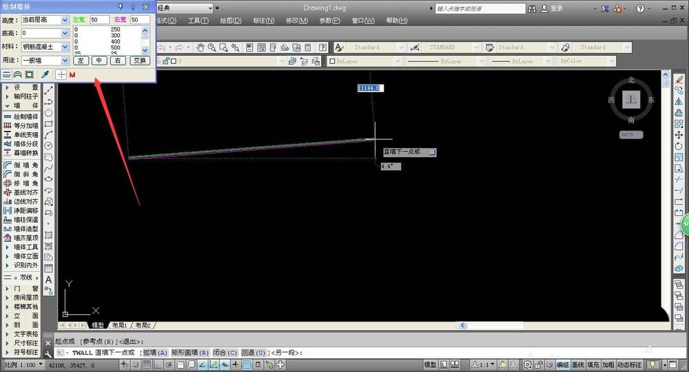 2、我们先进行基础墙体的绘制,在AUTOCAD绘图窗口的左方工具栏中,选择“墙体——绘制墙体”,进行墙体的绘制,系统会自动弹出墙体的设置窗口。