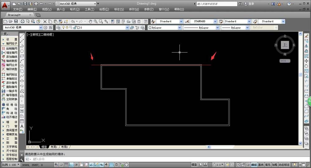 2、我们根据系统的操作提示,选择需要增加轴线的墙体,单击即可确定墙体,被选中的墙体会变成虚线,方便我们进行区分;确定完成墙体后,按下空格键即可确定并输出轴线。