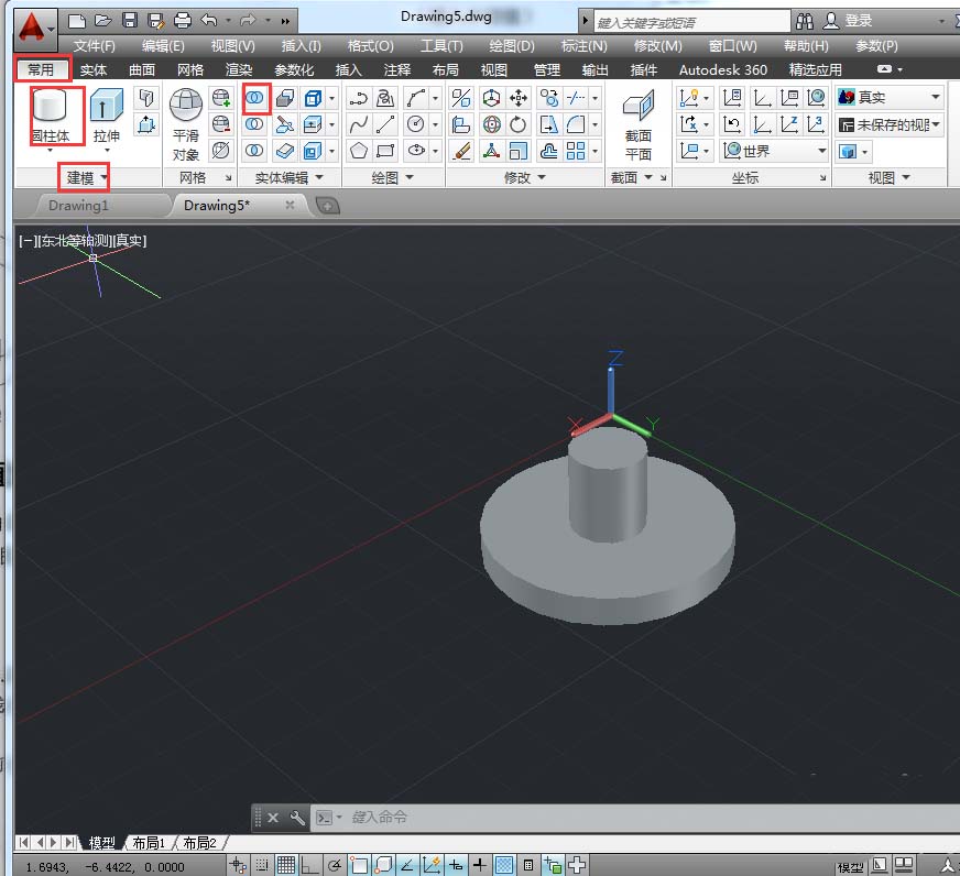1、首先通过【常用】》【建模】》【圆柱体】绘制两个圆柱,并通过【交集】操作合并两个圆柱。