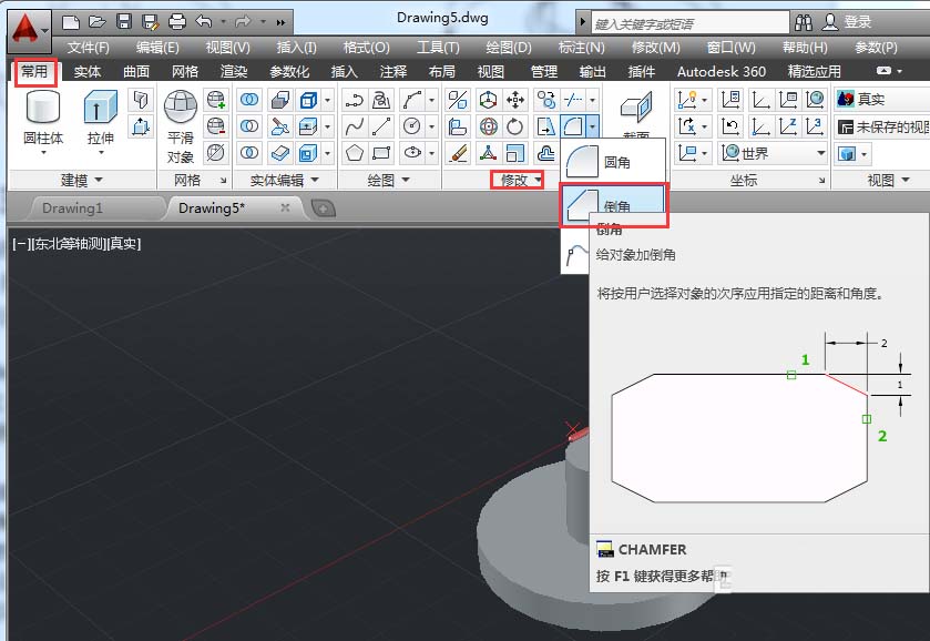 2、接着在菜单栏依次找到【常用】》【修改】》【倒角】选项。