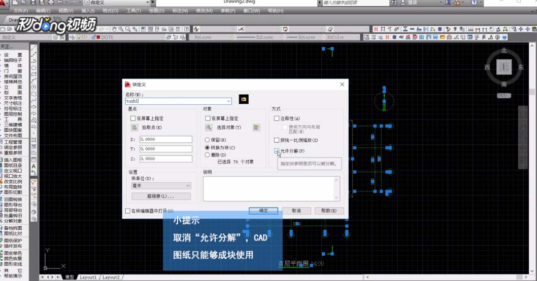 3、在弹出的对话框中,输入“块”的名称,在右侧,在窗口右侧的方式设置栏中,取消勾选“允许分解”,点击确定,即可将图纸成块,无法正常编辑