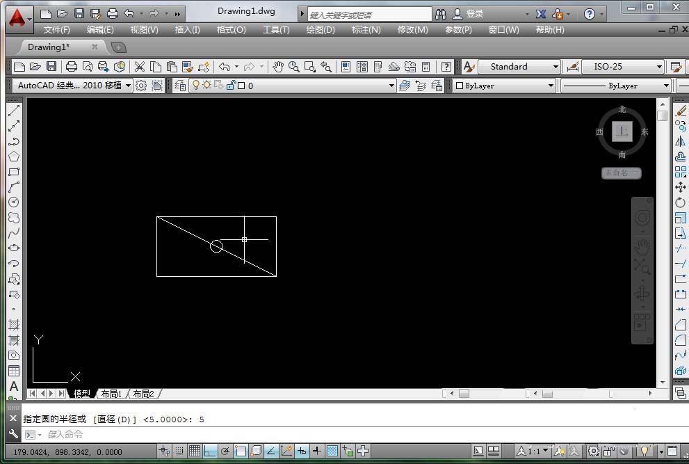 3、在对角线中心画一个半径5的圆;