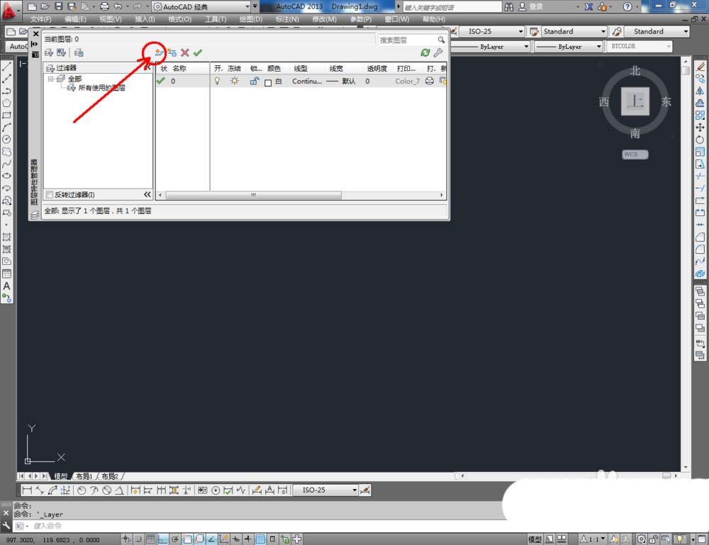 1、打开AutoCAD 2013软件,点击【图层特性管理器】,点击【新建图层】,将图层命名为:四斗柜。点击色块,按图示设置一个图层颜色,完成四斗柜图层的设置(如图所示);