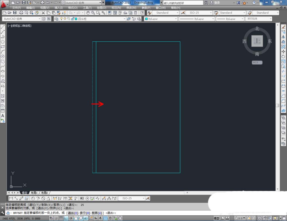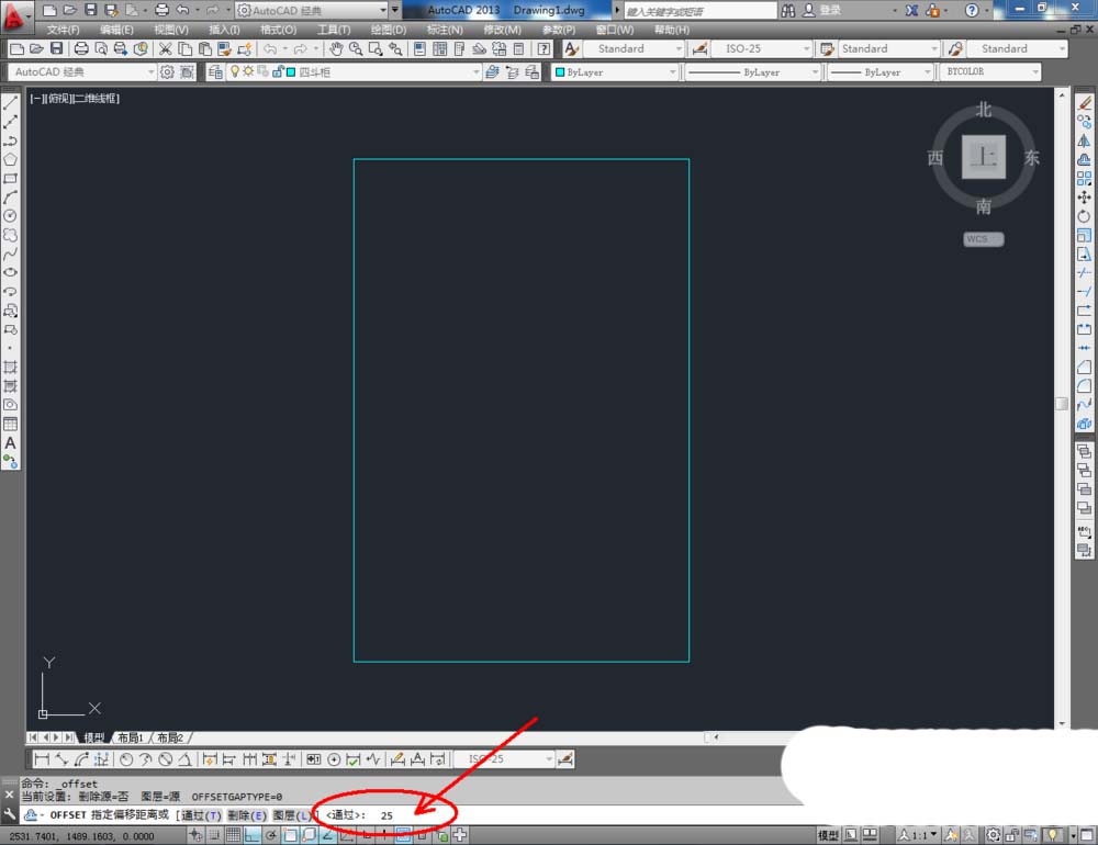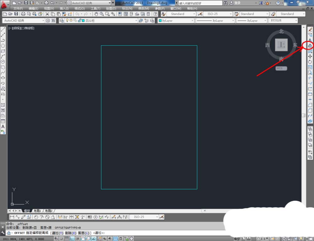 3、点击右边工具栏中的【偏移工具】,在命令栏输入偏移数值:25后,对左右两边以及顶边进行向内偏移操作。在命令栏输入偏移数值:80后,对图案底边进行向上偏移。完成后按图示调整好偏移线条上的节点(如图所示);