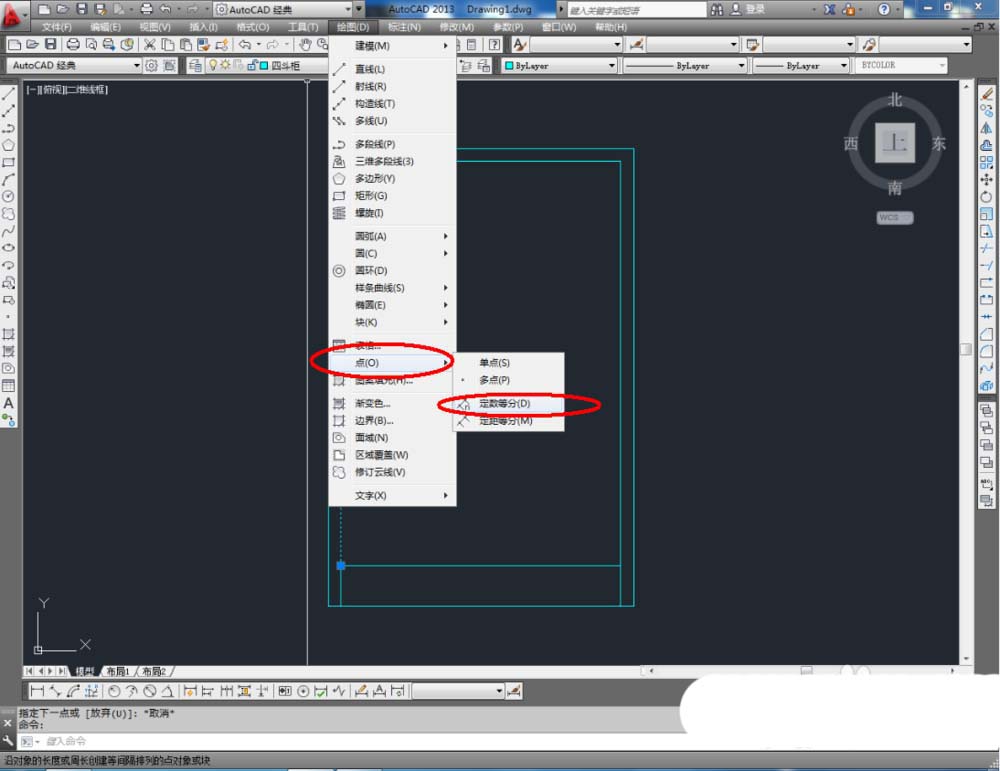4、点击【直线工具】按图示绘制一条直线后,点击【绘图】-【点】-【定数等分】,鼠标点击该直线,在命令栏输入:4,将其分成四等分(如图所示);