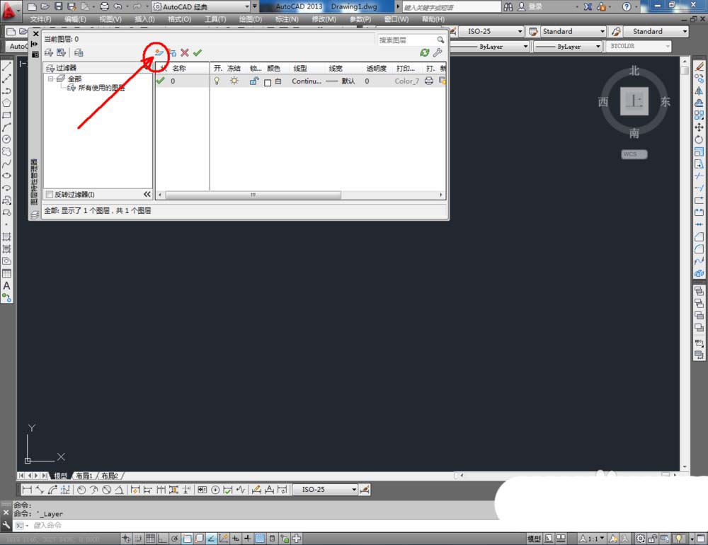 1、打开AutoCAD 2013软件,点击【图层特性管理器】,点击【新建图层】,将图层命名为:单抽写字台。点击色块,按图示设置一个图层颜色,完成单抽写字台图层的设置(如图所示);