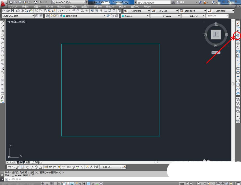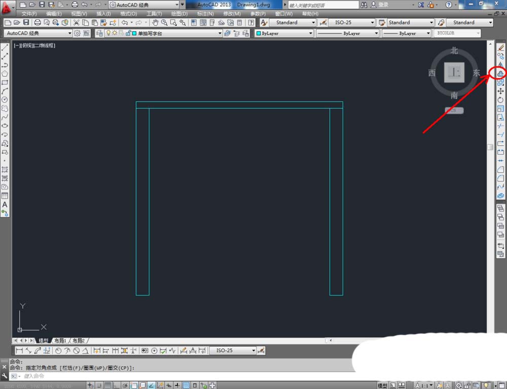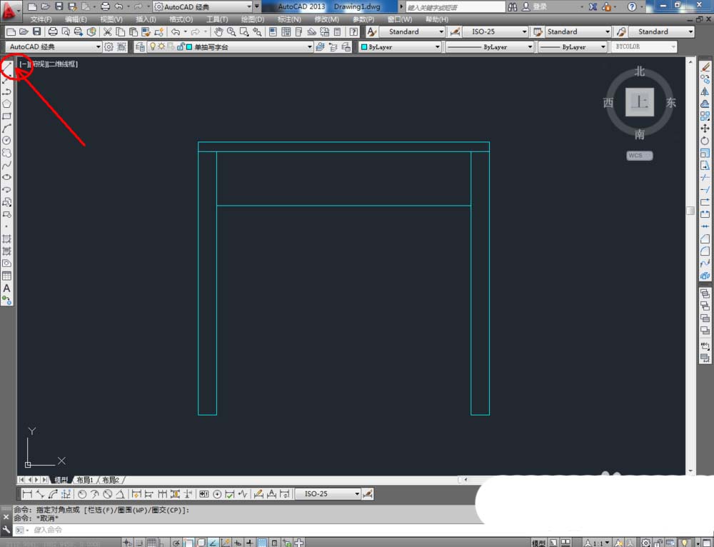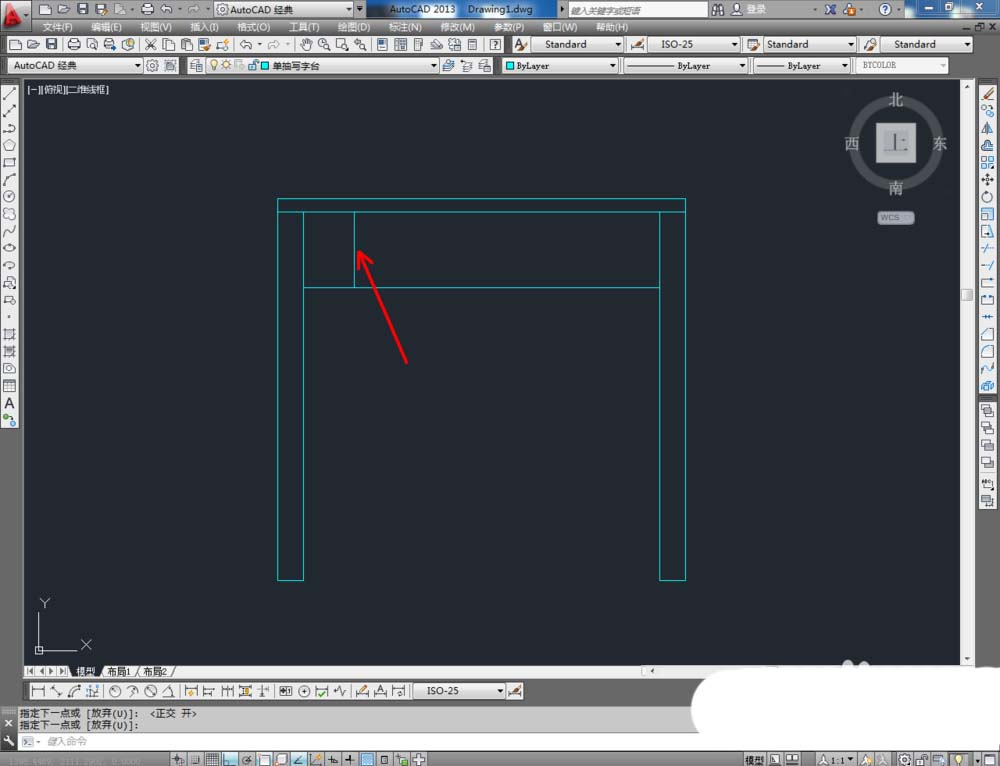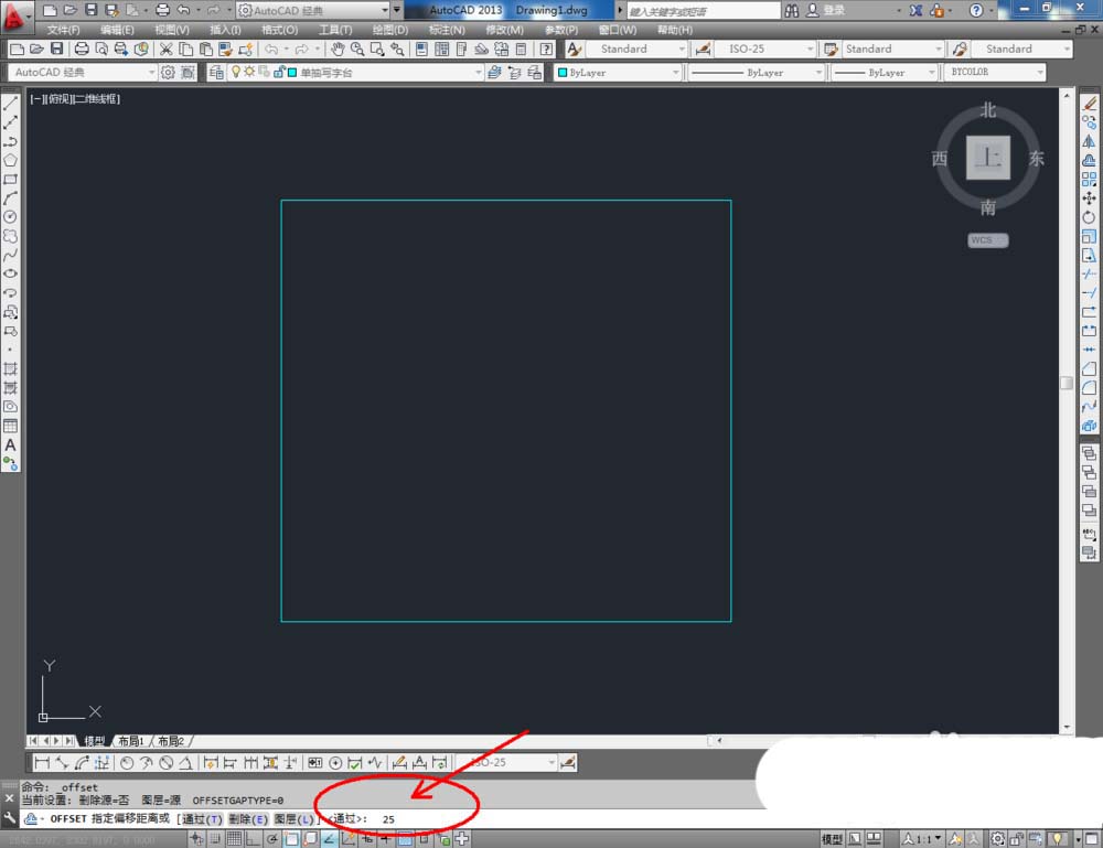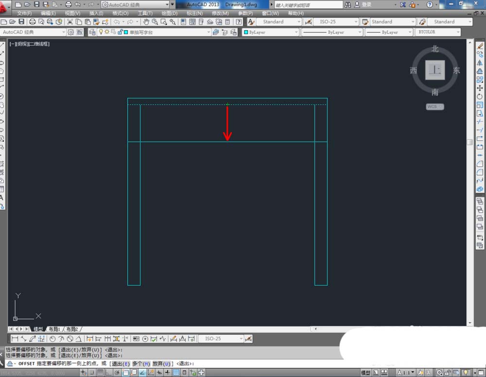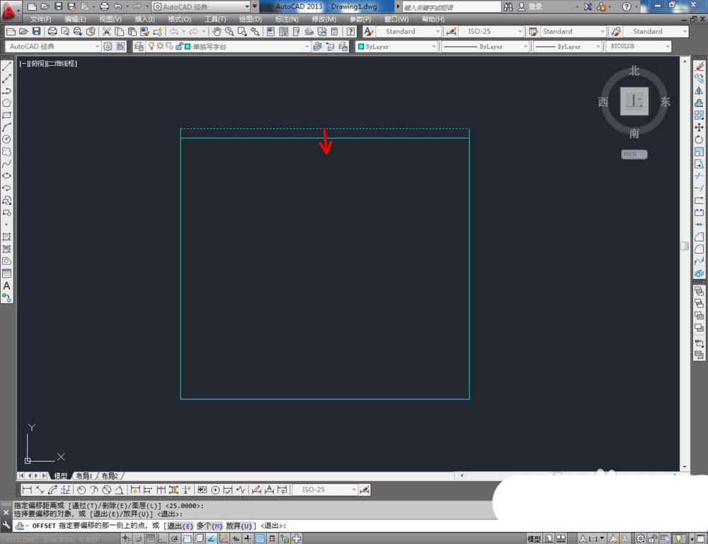 3、点击右边工具栏中的【偏移工具】,在命令栏输入偏移数值:25后,对顶边进行向下偏移。在命令栏输入偏移数值:50后,对侧边进行向内偏移。点击【修剪】对图示线段进行修剪(如图所示);