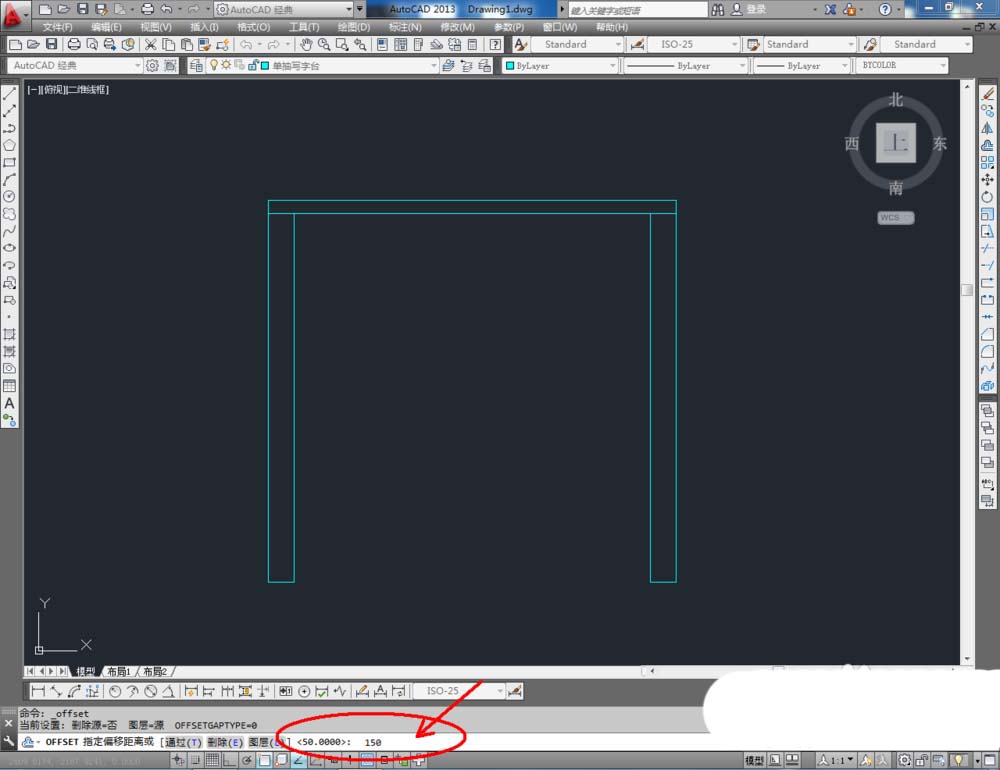 4、点击右边工具栏中的【偏移工具】,在命令栏输入偏移数值:150后,对图示线段进行偏移并调整好线段两段的节点位置;
