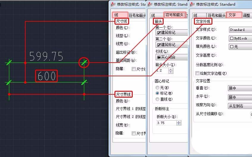 再认识一下基本的尺寸标注在AutoCAD中所对应的设置选项。