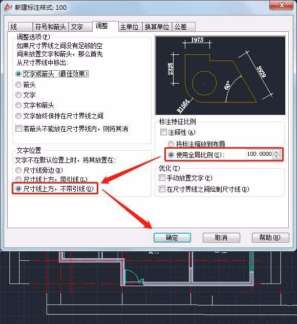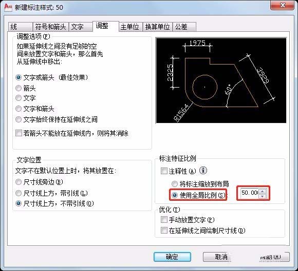2、“一键生成”1:50标注样式:“调整”选项卡中,“全局比例”参数设置为“50”——搞定!(其它文字、符号、线、主单位……等等外观样式保持不变的情况下,统统不用修改!)