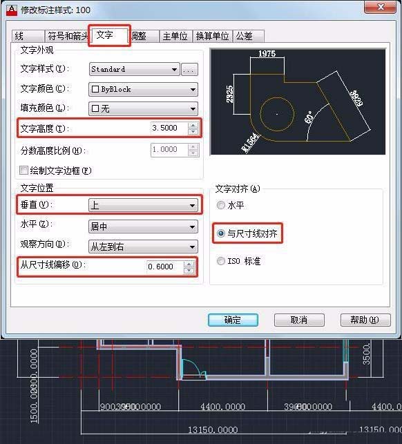 “文字位置|从尺寸线偏移:0.6”:即文字距离尺寸线0.6mm;