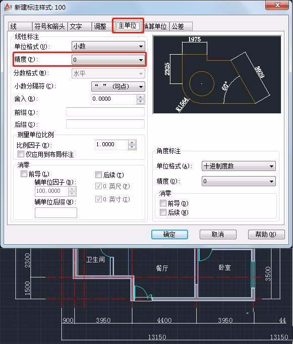 注:总平面图中常用“米”单位,标注尺寸精确到小数点后两位或三位,则“精度”参数相应设为“0.00”或“0.000”。