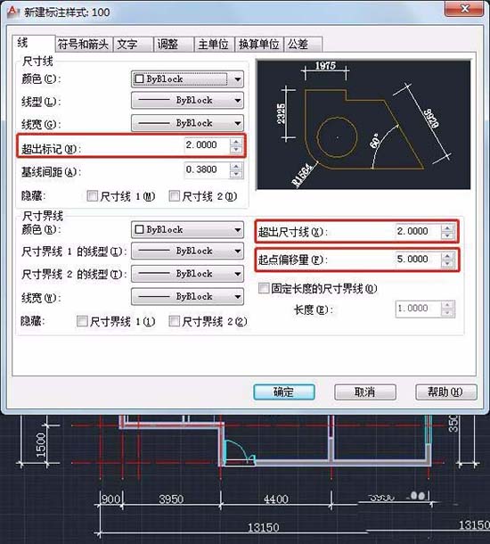 “起点偏移量:5”:即尺寸界线距离测量尺寸的点位5mm。