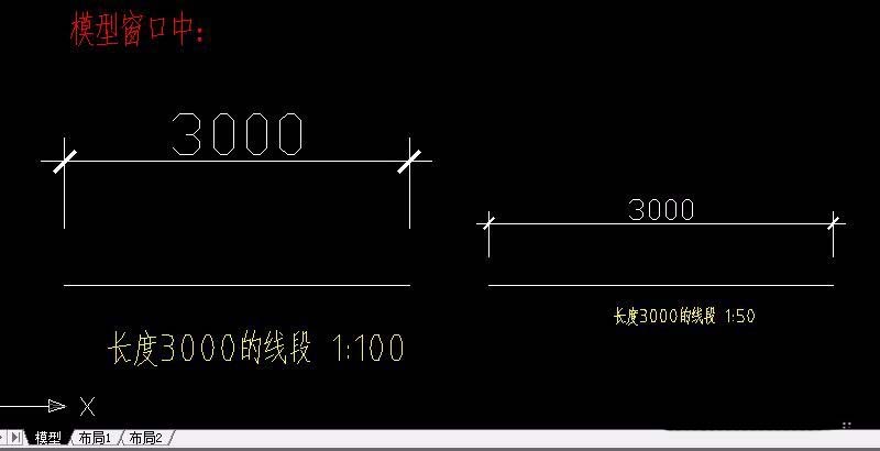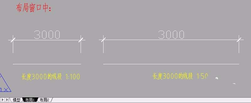 3、两种标注样式在模型窗口和布局窗口中的比较:在模型中,两条3000的线段长度相等,分别用“100”和“50”两种样式标注;在布局(即打印图纸)中,图样1:50比图样1:100大一倍,标注样式则完全一致。