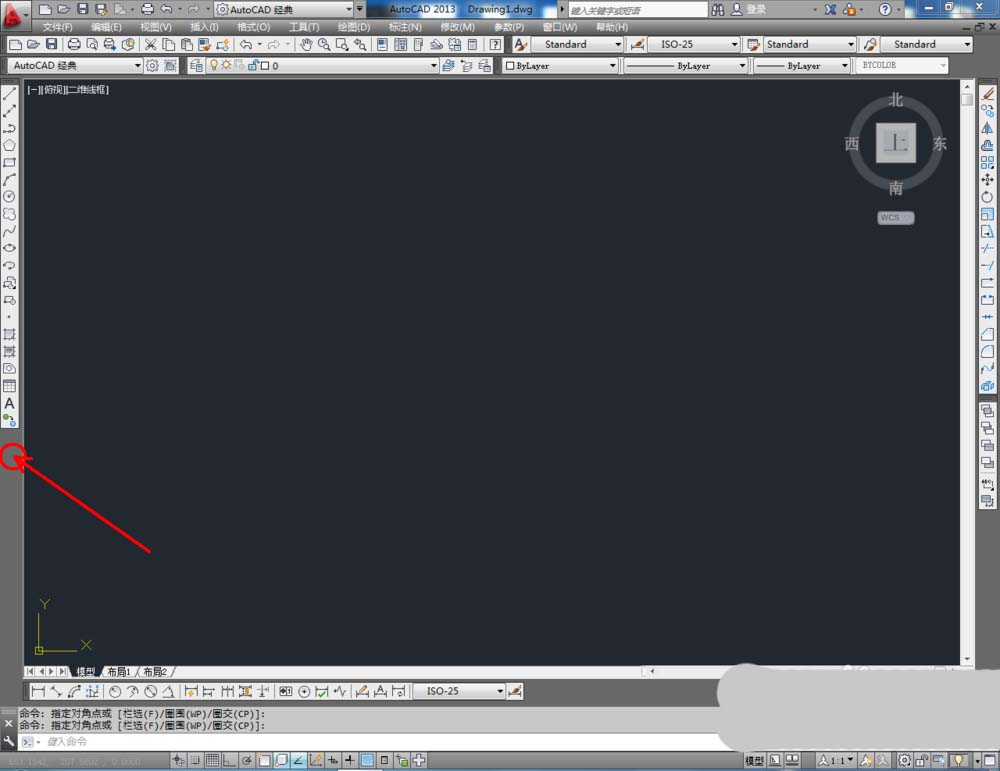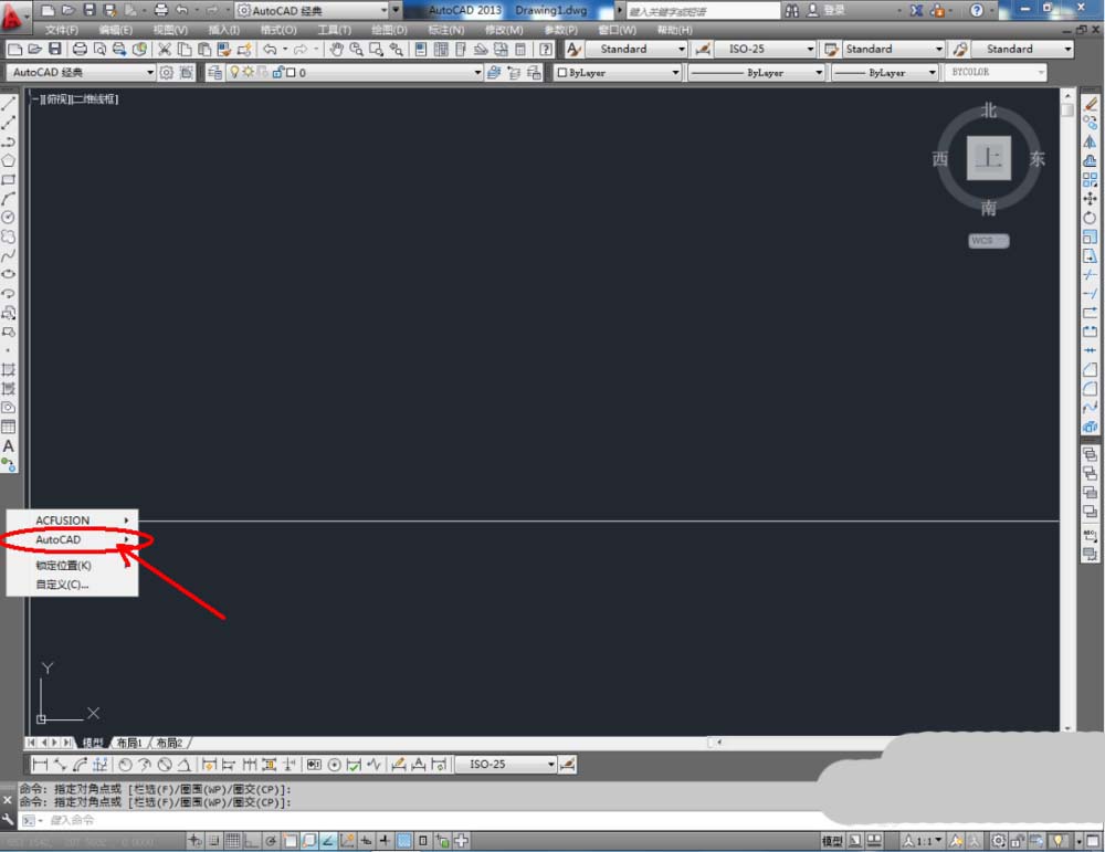 1、打开AutoCAD 2013软件,鼠标移动到图示区域,点击鼠标右键-【AutoCAD】,勾选【视图】、【视觉样式】和【三维导航】,将这三个工具栏调出并按图示调整好工具栏的位置;