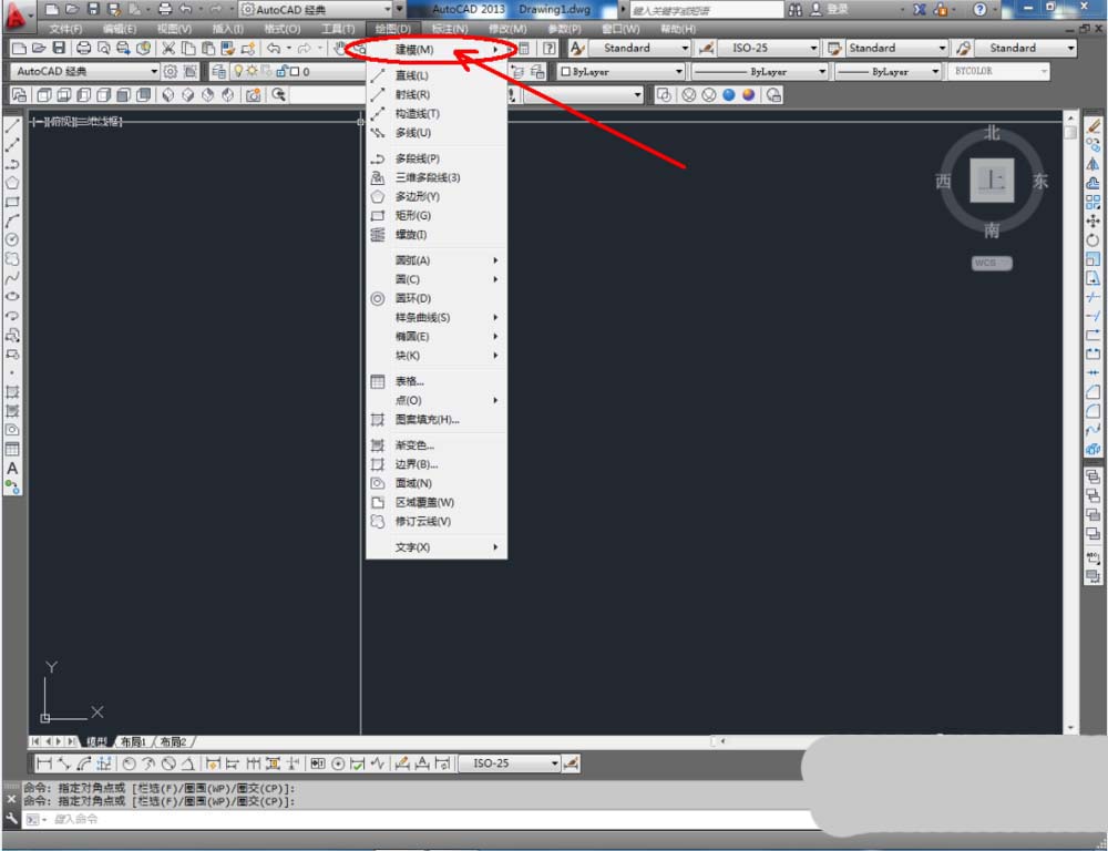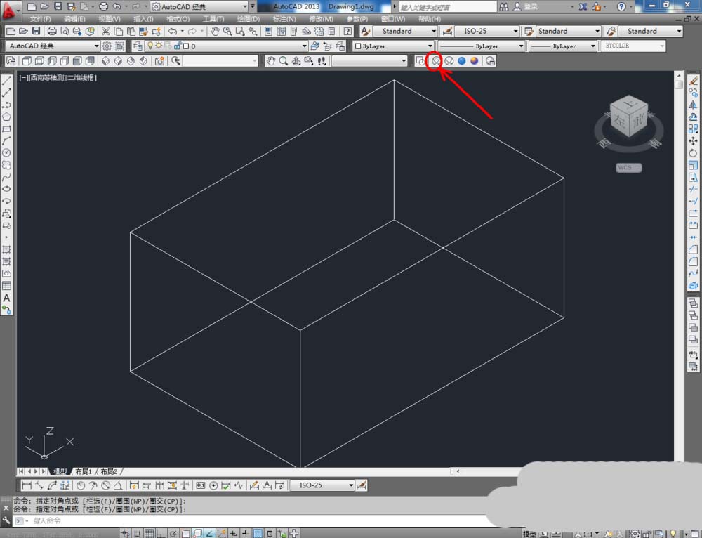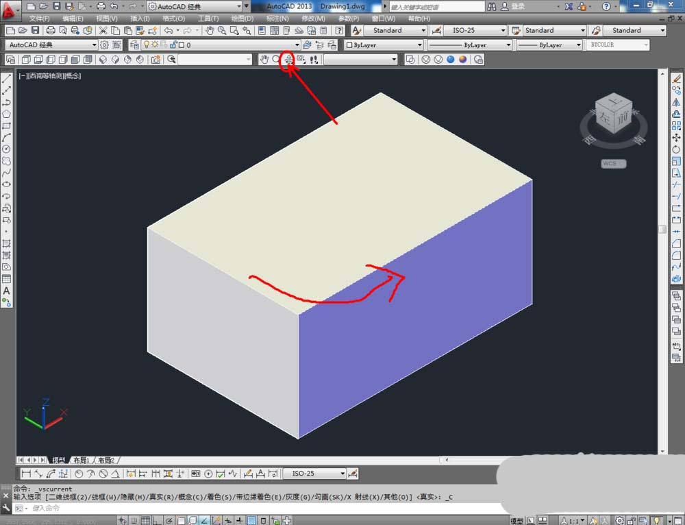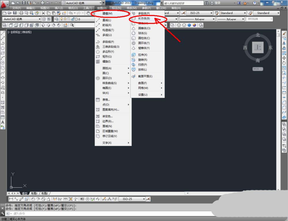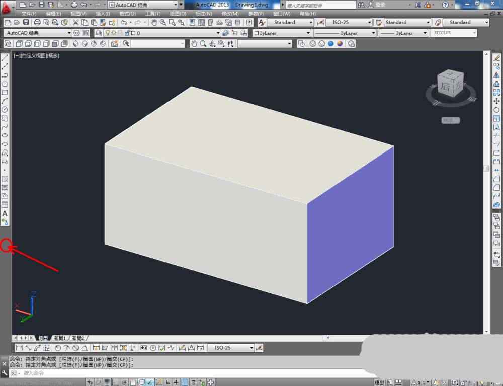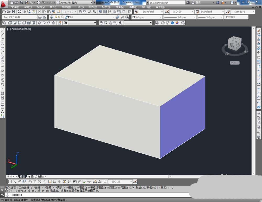 2、点击【绘图】-【建模】-【长方体】,按图示在作图区域绘制一个长方体模型。完成后,点击视图栏中的【西南等轴测】将视图切换为西南视角(如图所示);